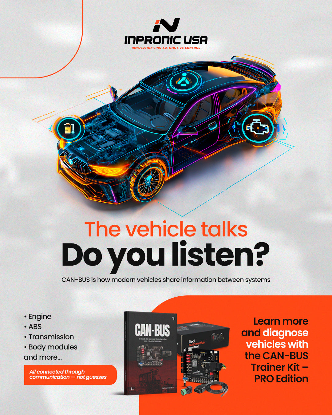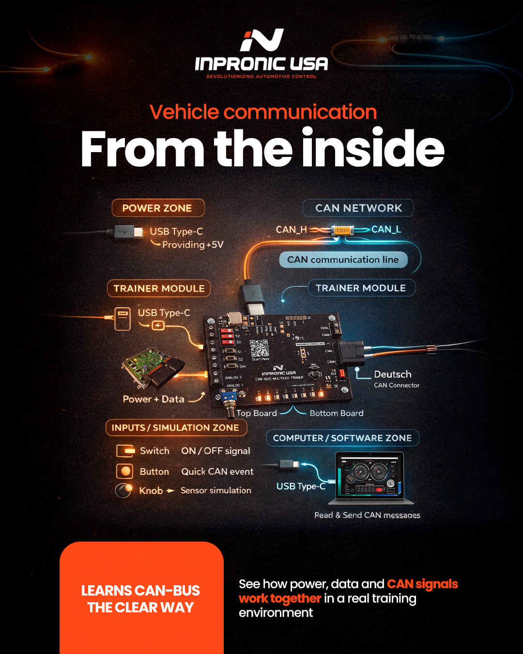 INPRONIC USA is more than a manufacturer of electronic boards. We develop professional CAN-BUS training equipment and vehicle network solutions designed to help technicians, educators, and institutions understand how modern automotive communication systems truly operate.